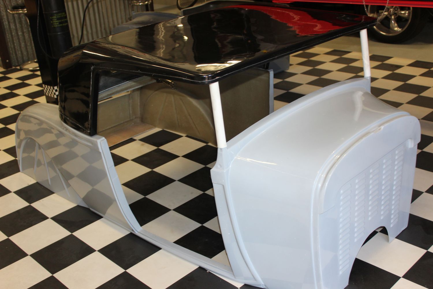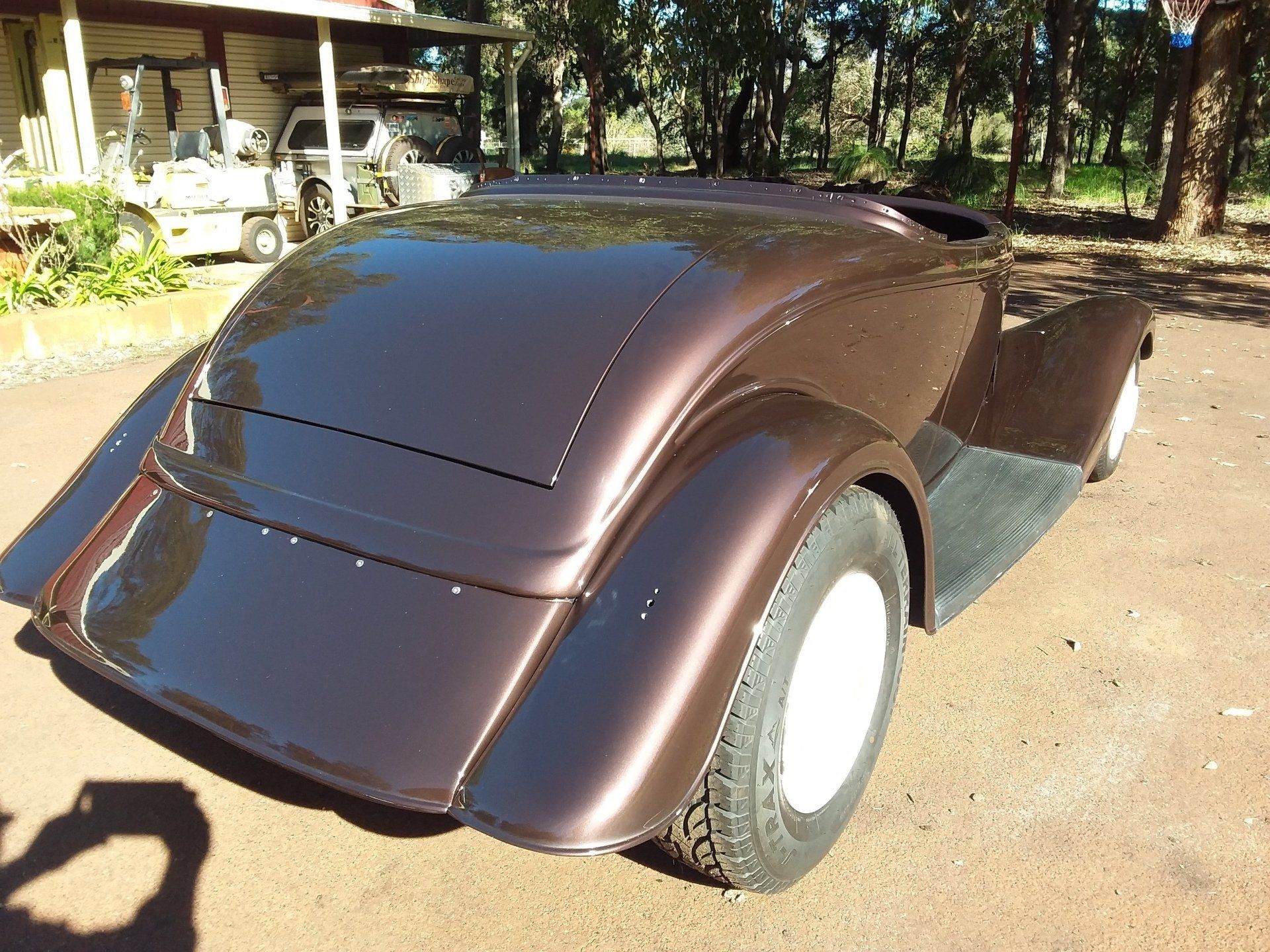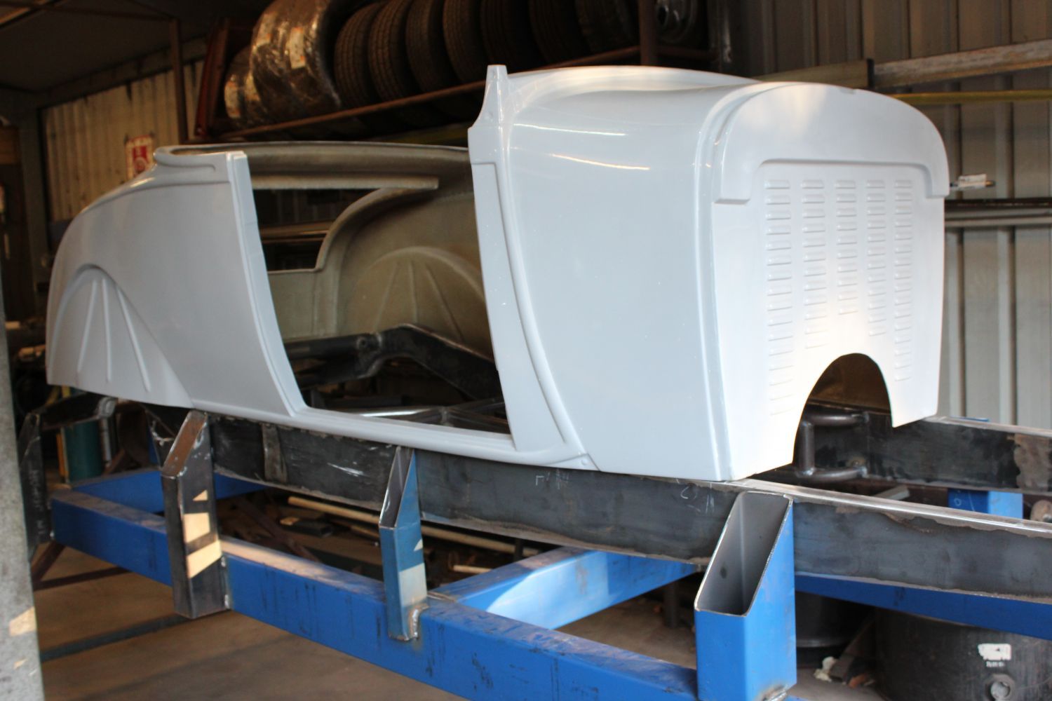 BODY FEATURES: Fibreglass reproduction, 3 inch longer doors and cockpit area(roadster, roadster pickup) 35 inch doors(tourer), fully steeled out with operational doors and boot lid, intrusion bars and burst-proof locks in doors, dashboard fitted and under dash 90 degree brake pedal and booster mount, option of standard or 4 inch recessed firewall.
