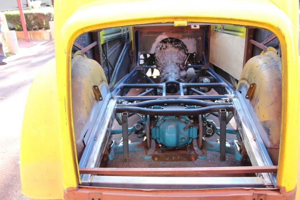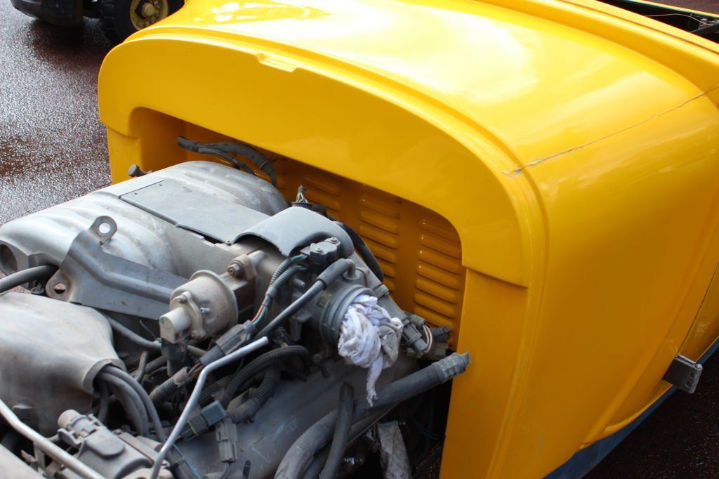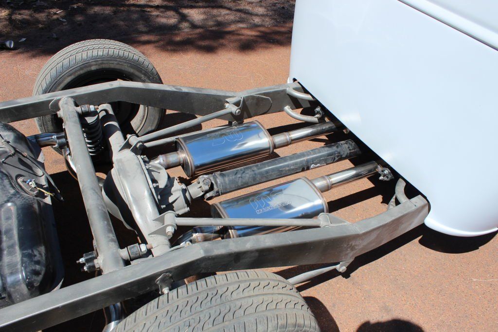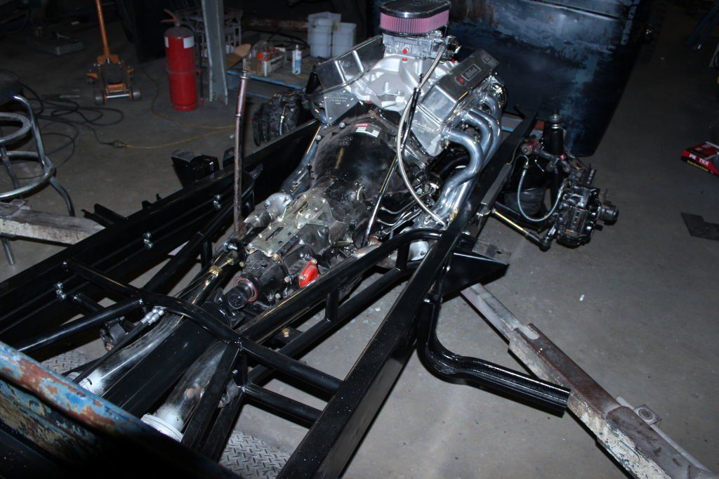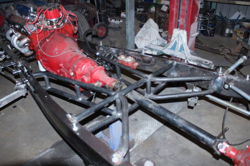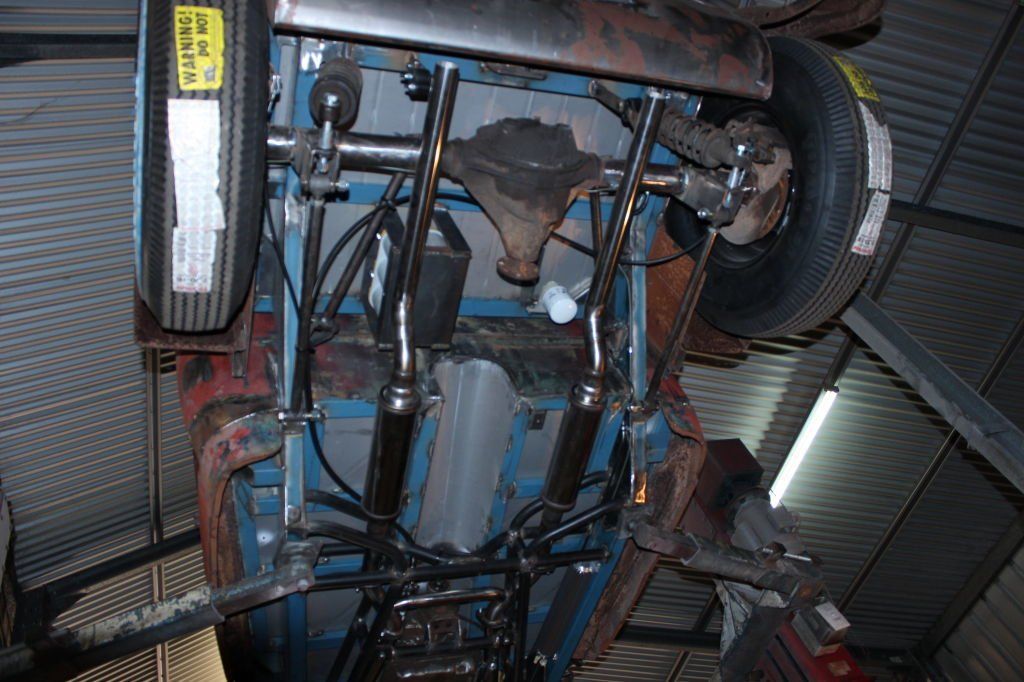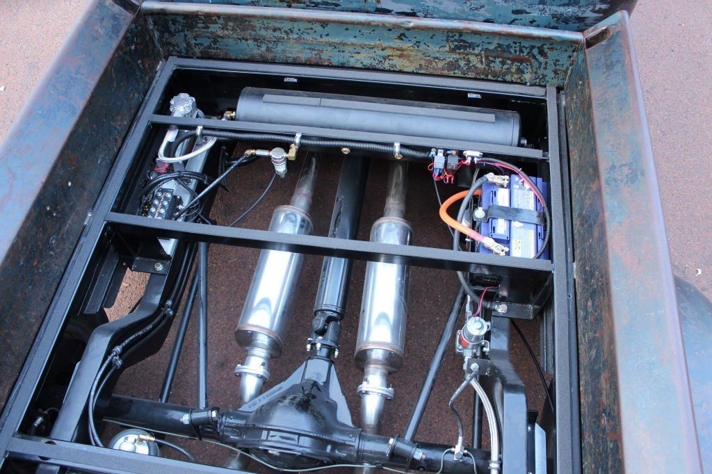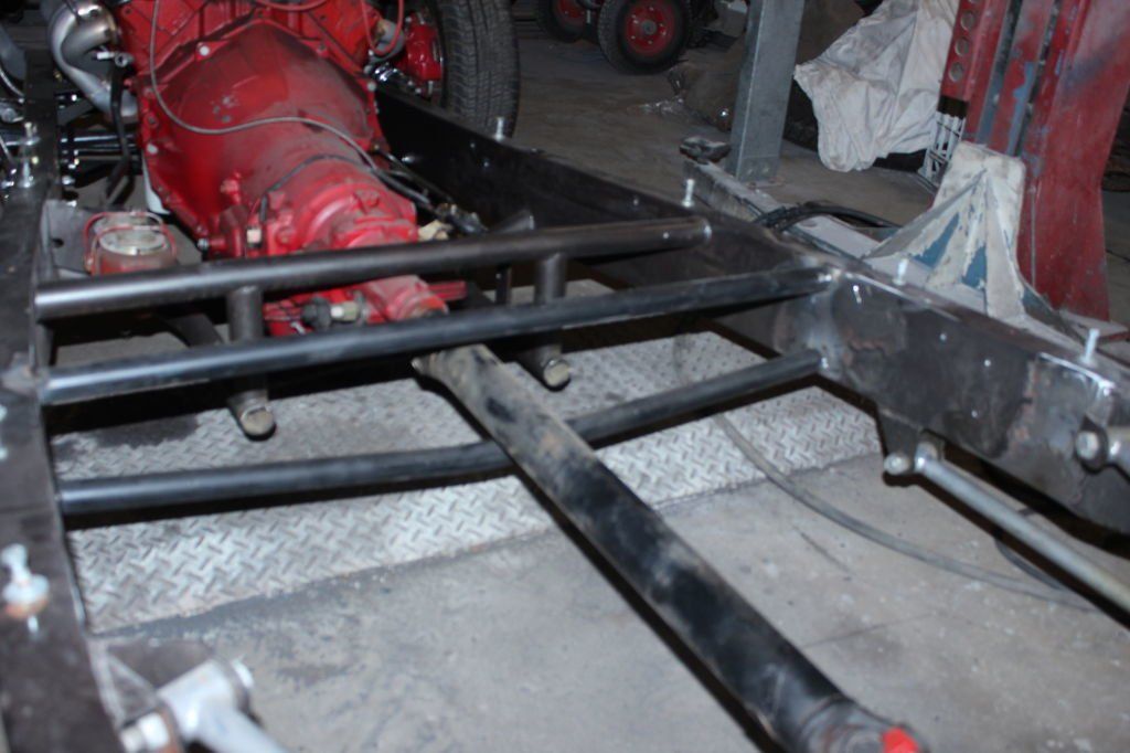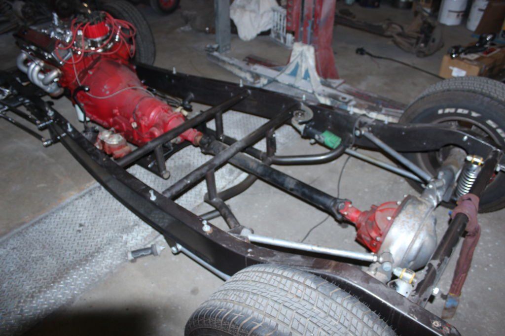 CHASSIS FEATURES: 107 inch wheel base, 1932 Hiboy Style, profile cut fabricated chassis rails, model A. dropped front cross member, tubular center “X” member , tubular rear cross member with shock mounts, rear chassis horns to mount 1932 fuel tank, 32 inch engine bay, fully welded.