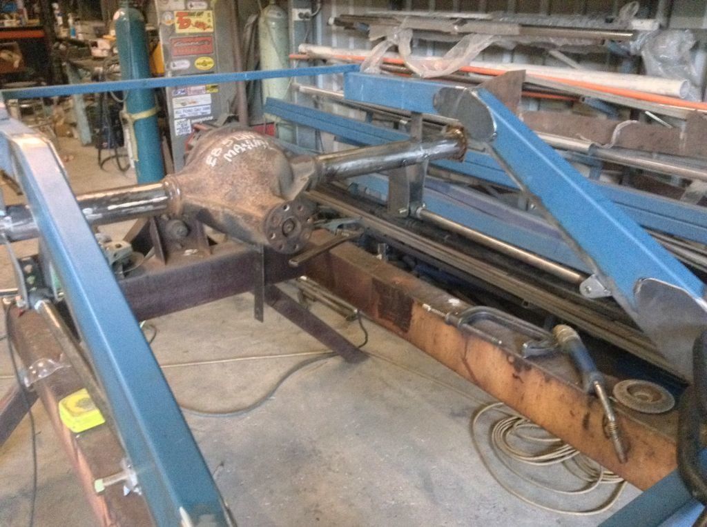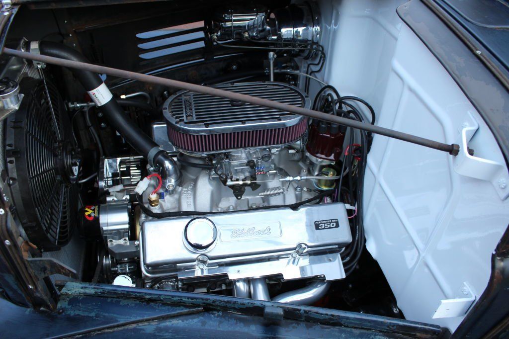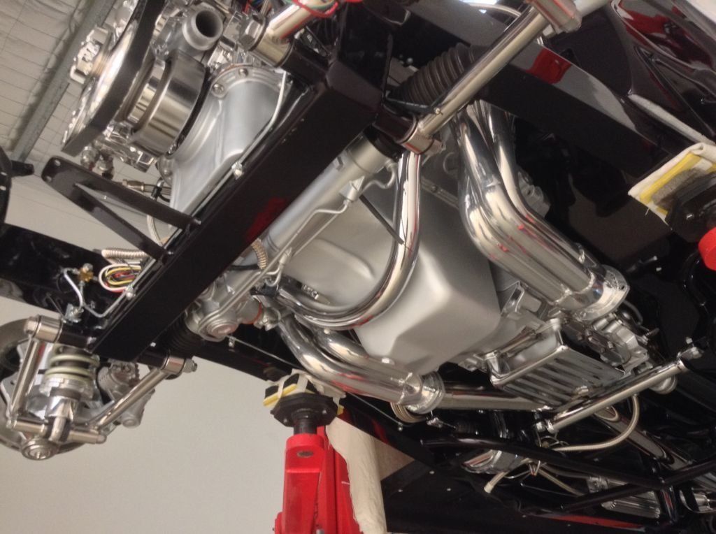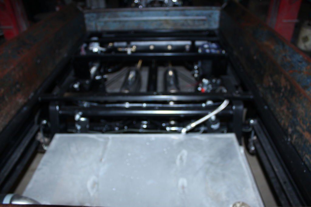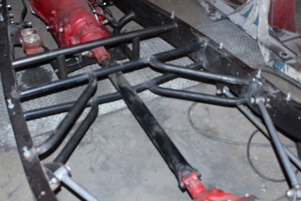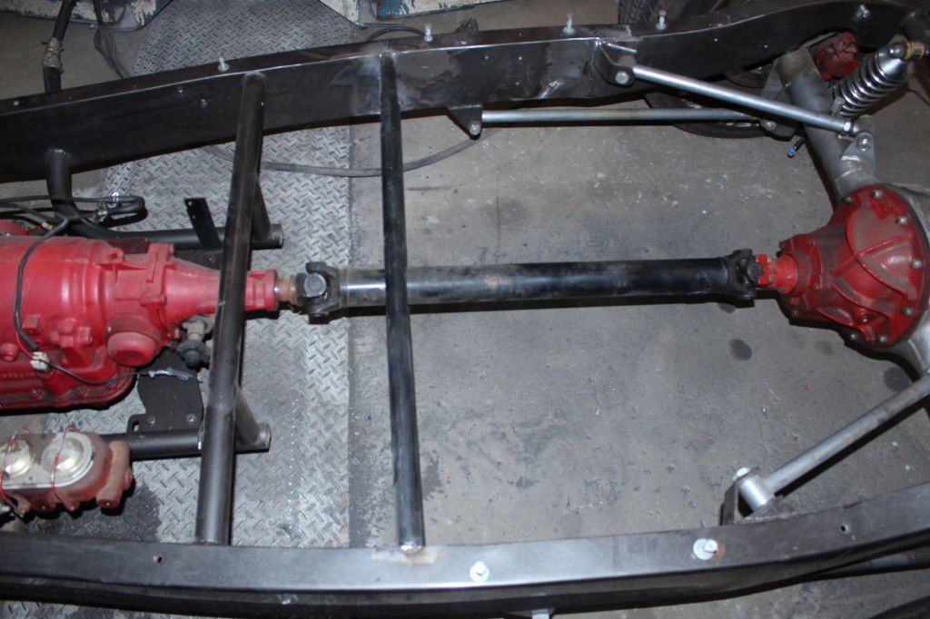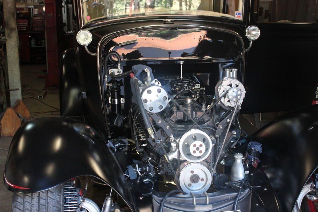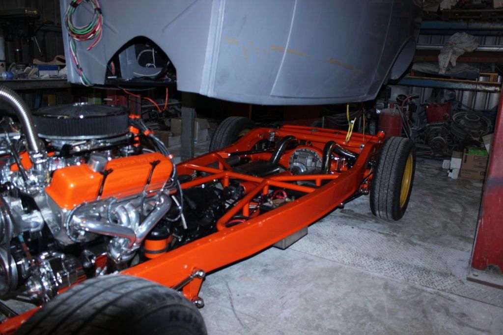 CHASSIS FEATURES: 107 inch wheel base, 1932 Hiboy Style, profile cut fabricated chassis rails, model A. dropped front cross member, tubular center “X” member , tubular rear cross member with shock mounts, rear chassis horns to mount 1932 fuel tank, 32 inch engine bay, fully welded.