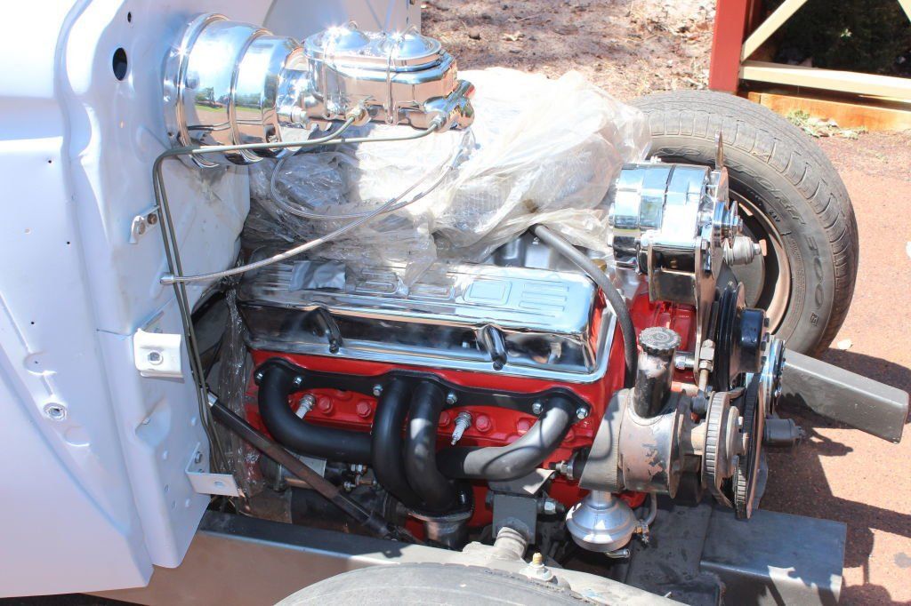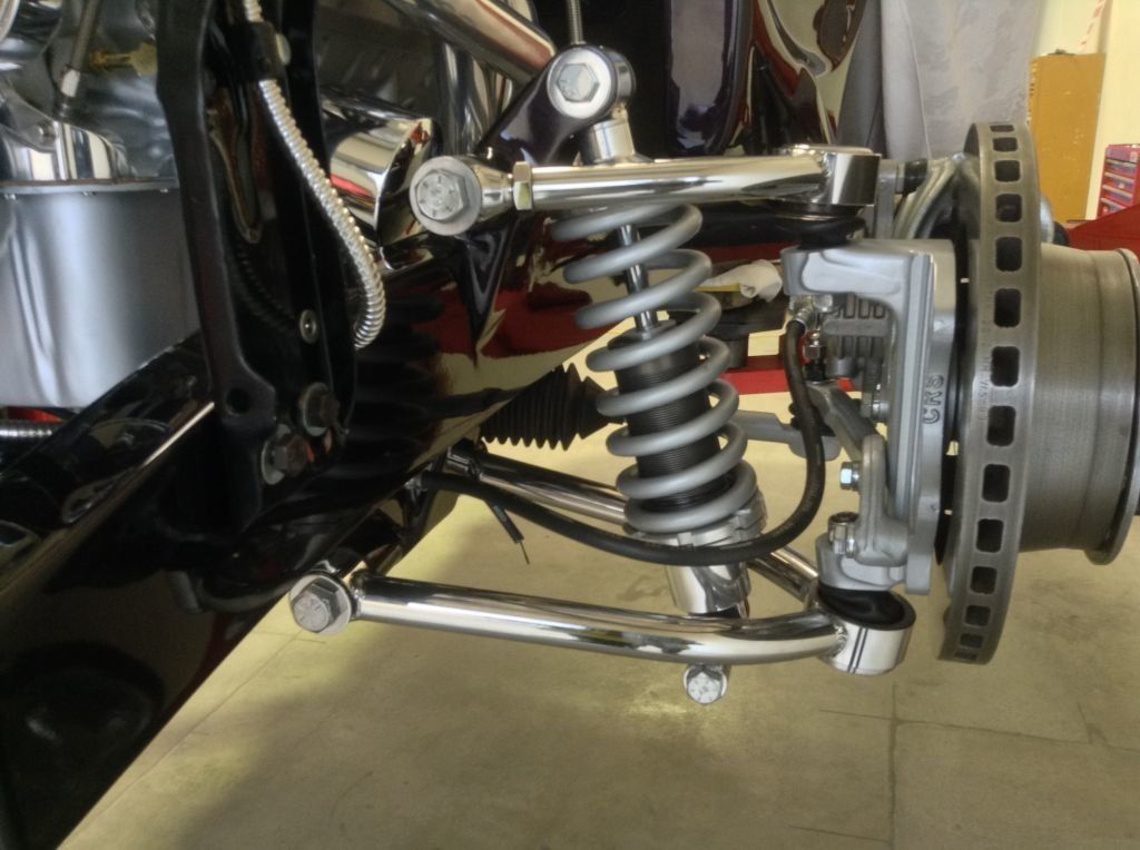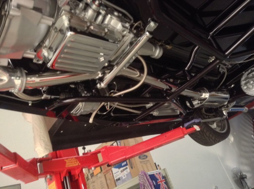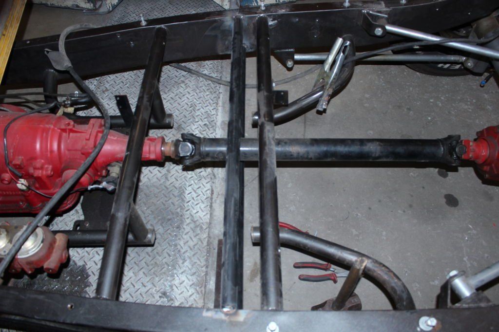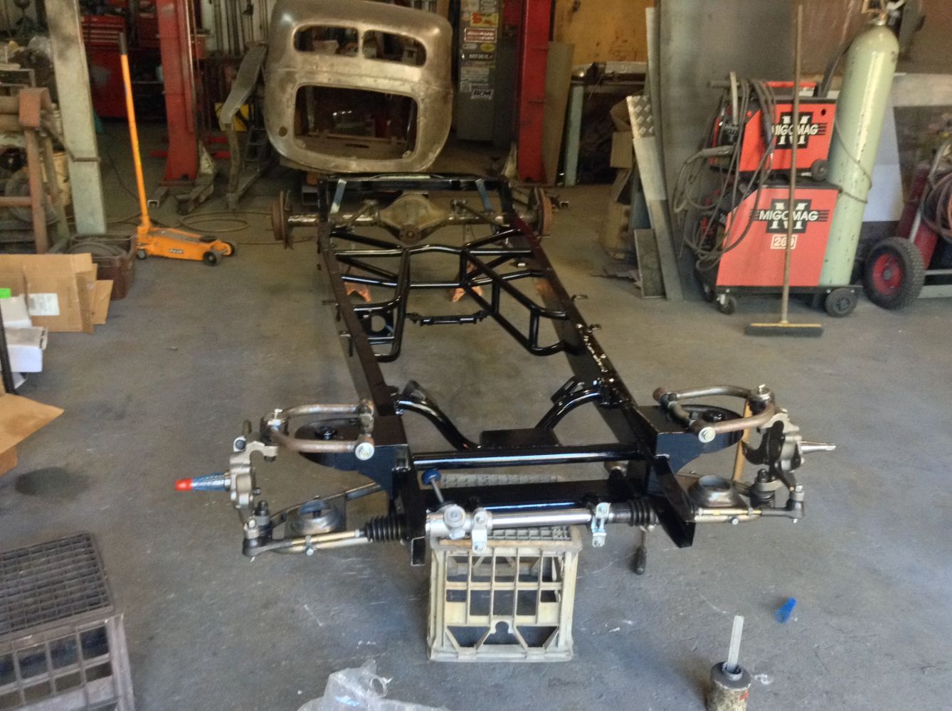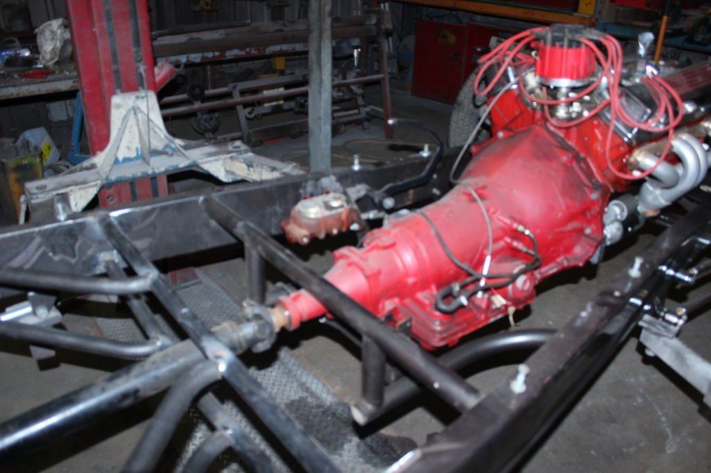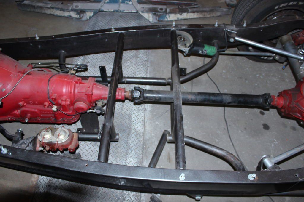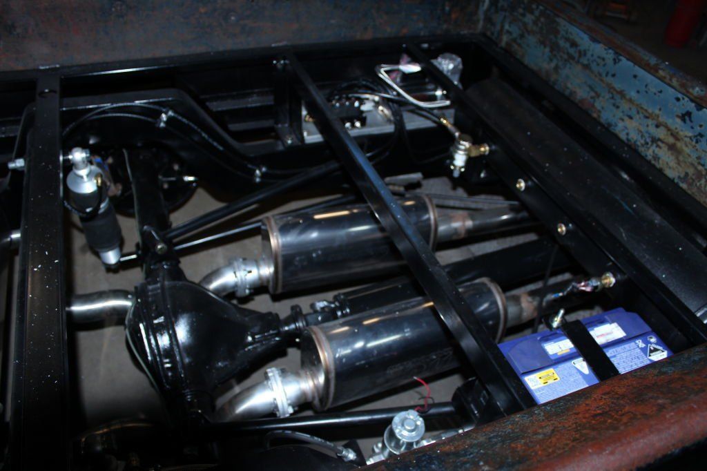 CHASSIS FEATURES: 107 inch wheel base, 1932 Hiboy Style, profile cut fabricated chassis rails, model A. dropped front cross member, tubular center “X” member , tubular rear cross member with shock mounts, rear chassis horns to mount 1932 fuel tank, 32 inch engine bay, fully welded.