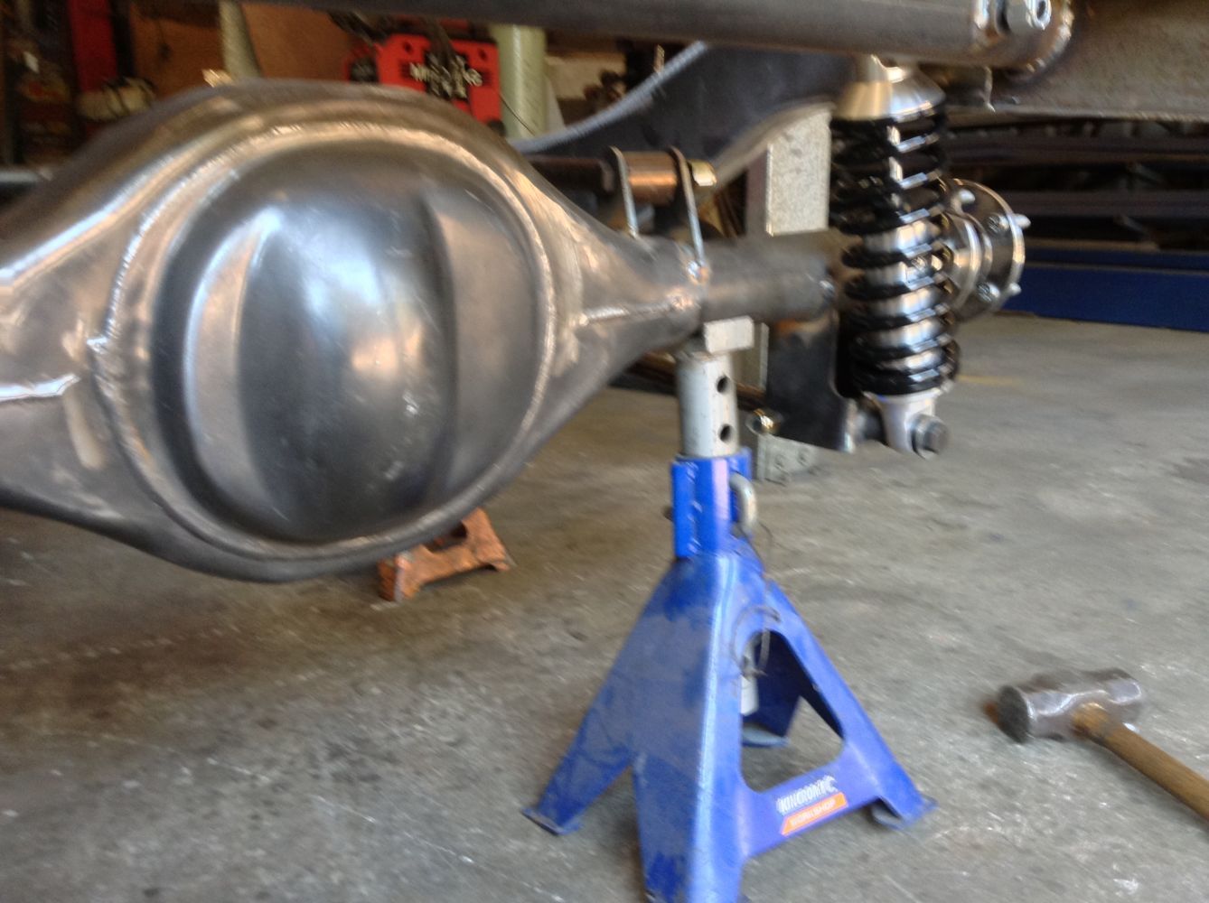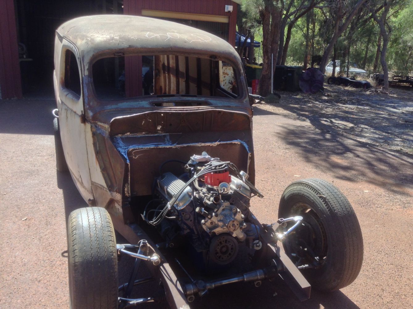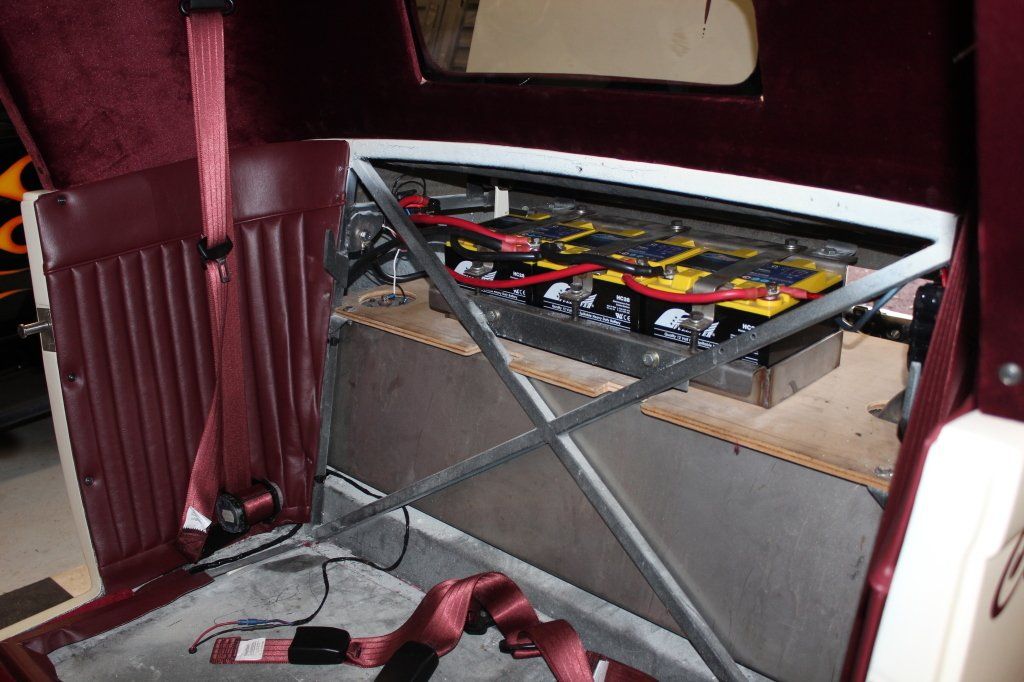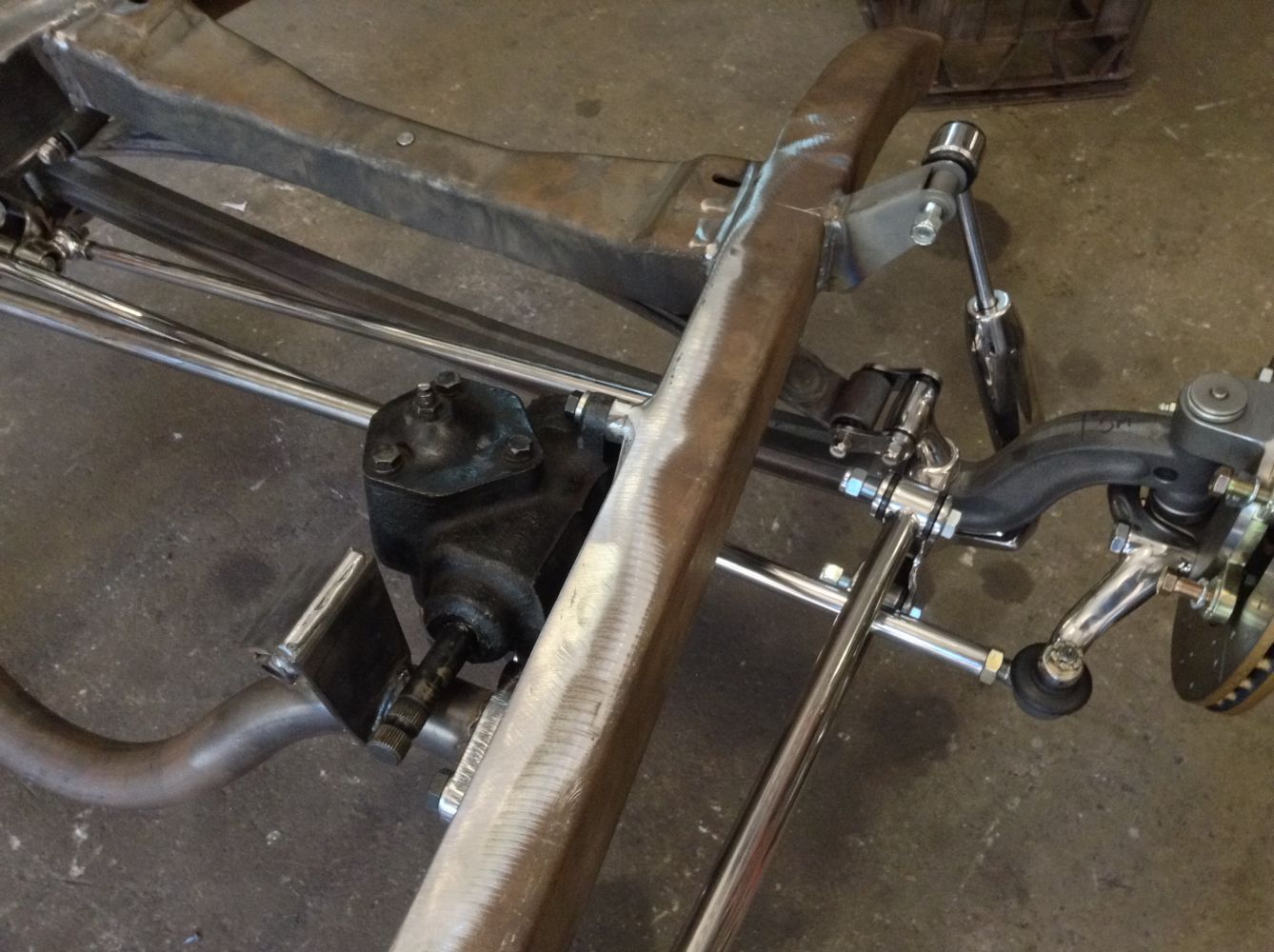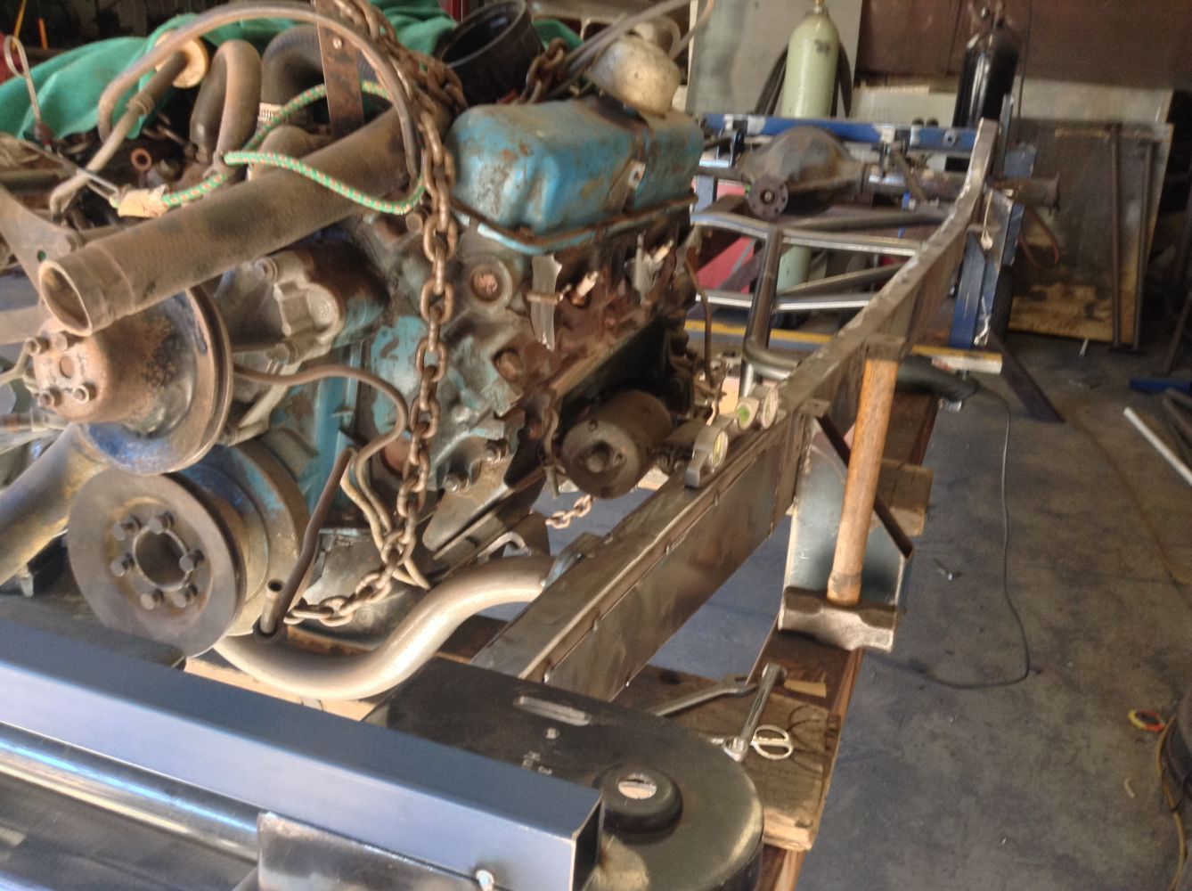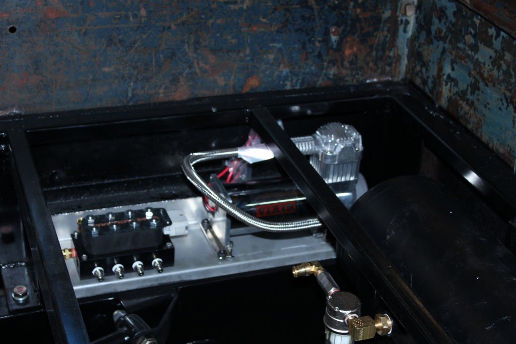 CHASSIS FEATURES: 107 inch wheel base, 1932 Hiboy Style, profile cut fabricated chassis rails, model A. dropped front cross member, tubular center “X” member , tubular rear cross member with shock mounts, rear chassis horns to mount 1932 fuel tank, 32 inch engine bay, fully welded.
